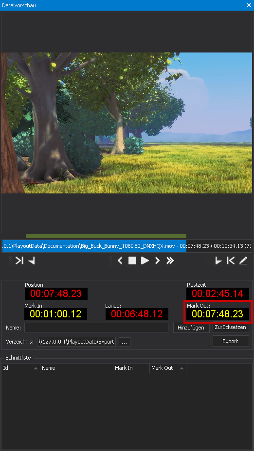 .Der Zeitpunkt für den Mark-in wird gesetzt und der gewählte Timecode im Feld Mark In angezeigt.