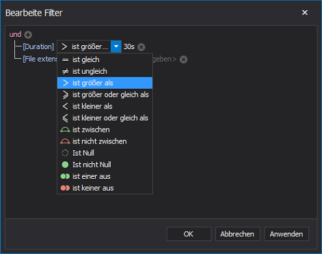 | Filter bearbeiten... | Menü zum Erstellen benutzerdefinierter Suchfilter öffnen