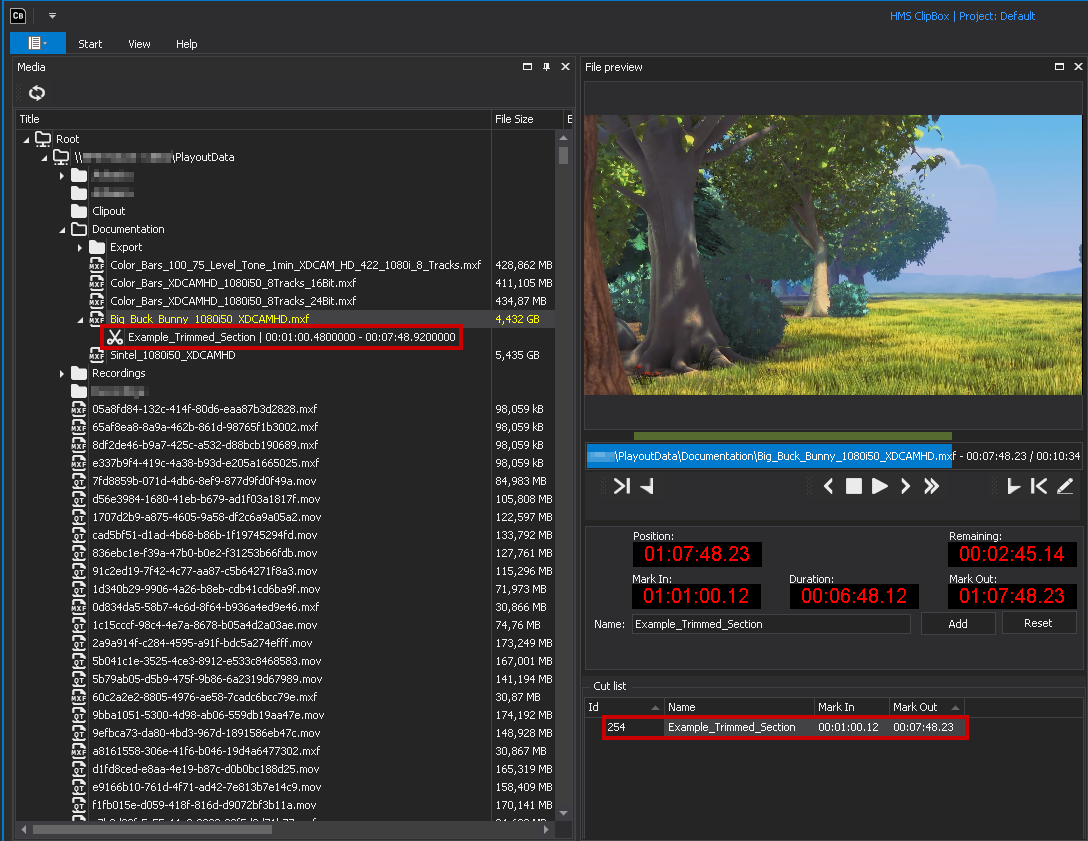 The set mark in and out points are saved internally, and the trimmed section is afterwards displayed in the Media window as a subordinate element of the corresponding original file. The trimmed section can be used like an original file and can be viewed, for example, via the File preview window or played via a player.